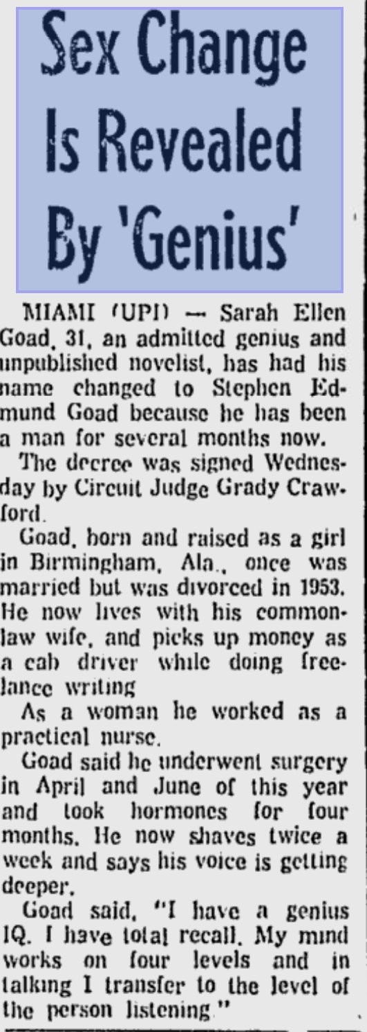 Goad, from Birmingham, Alabama, worked as a nurse pre-transition, and was married for a while, but was divorced in 1953. He had surgeries in April and June 1960, and then in September, in Miami, legally changed his name. He was living with a common-law wife, mainly working as a cab driver, and doing some free-lance writing. The journalist described him as “an admitted genius and unpublished novelist”.
